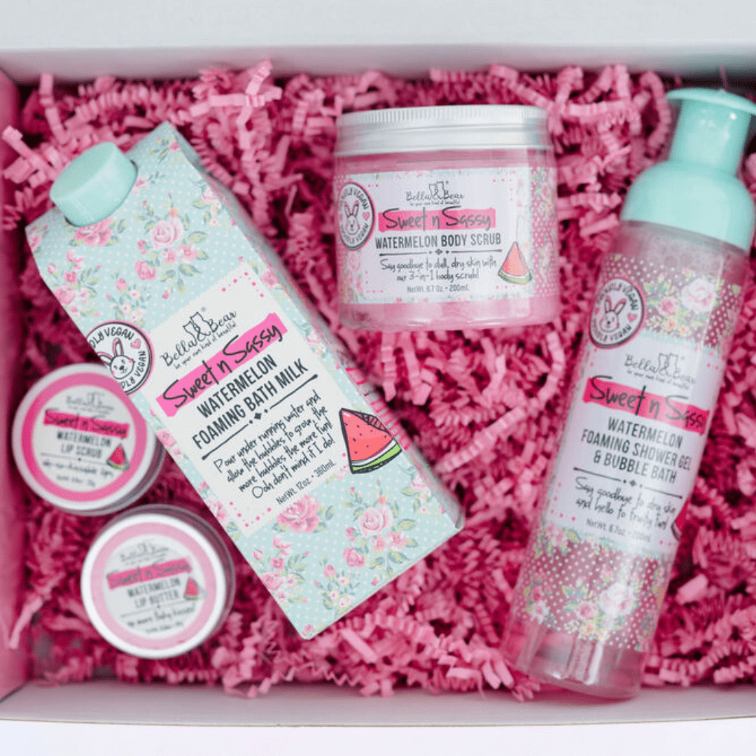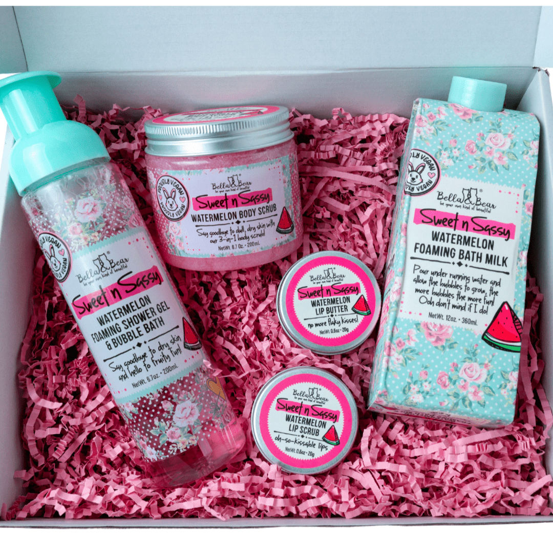 Get ready for a burst of sweetness with the Bella and Bear Sweet 'n' Sassy Watermelon Gift Set! This delightful collection includes everything you need for a fun and fruity pampering session: a 2-in-1 foaming shower gel & bubble bath, a moisturizing body scrub, a foaming bath milk, a nourishing lip butter, and an exfoliating lip scrub. All infused with the irresistible scent of juicy watermelon, it's a sweet treat for your skin and your senses!