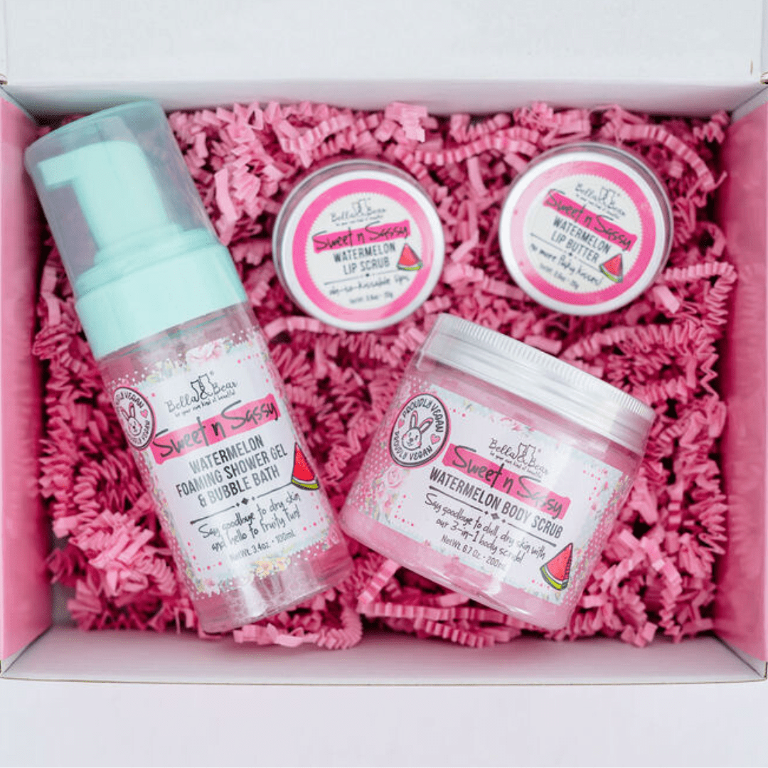 Get ready for seriously smooth and radiant skin with the Bella and Bear Sweet 'n' Sassy Watermelon Body Scrub! This 3-in-1 scrub gently exfoliates, cleanses, and moisturizes, leaving your skin feeling refreshed, rejuvenated, and smelling delicious. Infused with the sweet and juicy aroma of fresh watermelon, it's a treat for your senses and a must-have for your body care routine.
