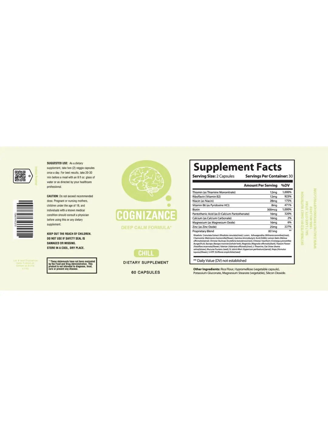 Cognizance The Chill Pill supplement contains vitamins, minerals and natural herbs. We selected ingredients that are believed to have calming and relaxing benefits. For example vitamin B is important in helping to maintain nerve functions and chamomile tea is often drunk in order to relax the mind and body.