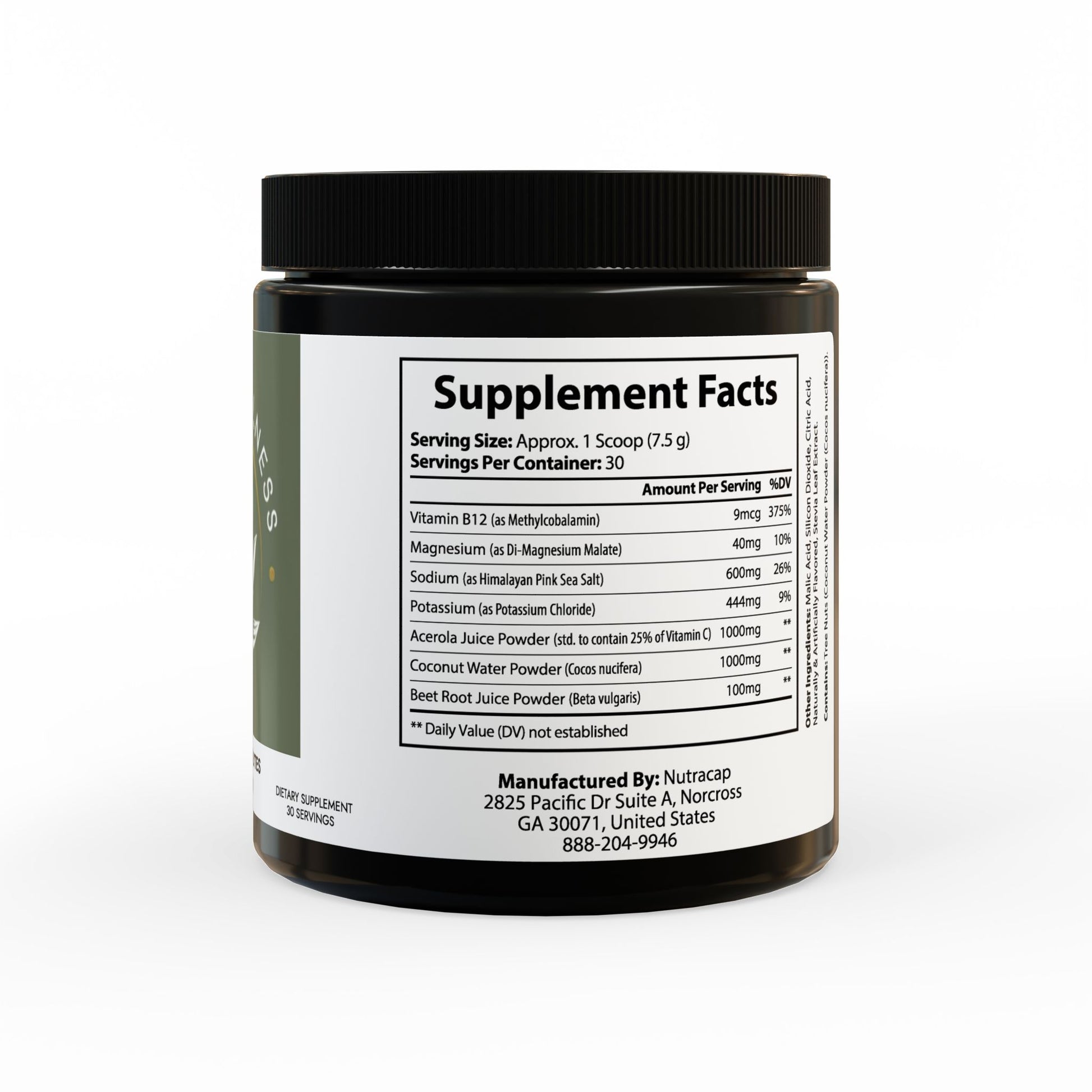 Key ingredients include Vitamin B12, Magnesium, Sodium (as Himalayan Pink Sea Salt), Potassium, Acerola Juice Powder (standardized to contain 25% Vitamin C), Coconut Water Powder, and Beet Root Juice Powder.
