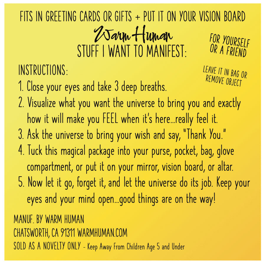 Each 3 x 3 package comes with a manifesting card and instructions on how to manifest, plus a super attractor Magical Power Object to carry with you or pin to your vision board to make it come true. You can keep it all together in the bag or carry the Magical Power Object in your purse or pocket separately!