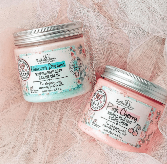 Experience a touch of enchantment with Bella and Bear's Unicorn Dreams Whipped Bath Soap & Shave Cream! This delightful 2-in-1 product will transform your shower into a whimsical escape. Lather up for a gentle cleanse, or use it to achieve a smooth, close shave, all while enjoying a playful, sweet scent reminiscent of pink and blue cotton candy.